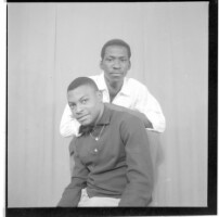Two men in the studio; one wearing a black shirt and sitting, the other wearing a white shirt and leaning against his back