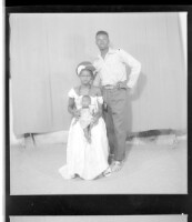 A family of three in the studio; a woman sitting with a baby on her lap and a man standing next to them