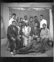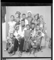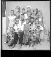 A family of twelve in the studio; two men sitting with two little girls, and one standing, and one kneeling, and five other girls and one boy standing in back (same group from Image 04159)