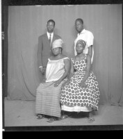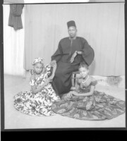 A man sitting in the studio wearing a black boubou and fez and two girl sitting on the floor in front of him