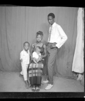 A man wearing a shirt standing in profile and a woman with a baby sitting face-forward next to a child in the studio.
