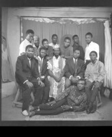 A photo of a group of 12 men: 5 sitting face-forward, 7 standing behind, and 1 laying on the ground in the studio.