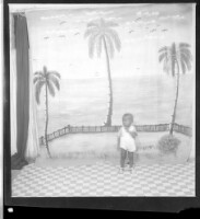 A little boy standing in front of a palm tree backdrop in the studio and wearing white overalls (same boy from Image 05783)