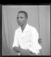 A young man sitting in the studio with his arms crossed and wearing a white shirt and a watch on his right arm