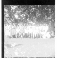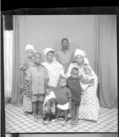 A family of eight in the studio; two women in white dresses sitting with a baby, three small boys standing in front with a little girl, and another boy standing in back