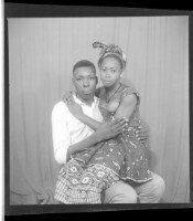 A couple sitting in the studio; the man wearing a white shirt and pants and the woman wearing a dress and a necklace