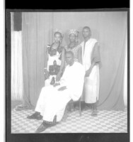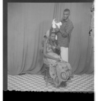 Four people in the studio: a man wearing a boubou and two women wearing pagnes standing in profile and a man wearing a boubou sitting in profile.