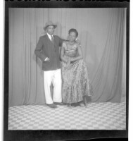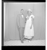 A man wearing a suit standing face-forward near a woman in a dress, pagne, head wrap, and necklace standing in profile in the studio.