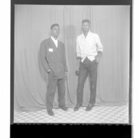 Two men: one wearing a suit and the other wearing a shirt and pants, both standing, one face-forward and the other in profile in the studio.