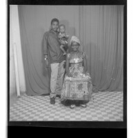 A man wearing a shirt and pants, holding a baby, standing in profile next to a woman wearing a dress and head wrap sitting face-forward in the studio.