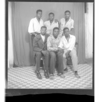 Six men, three sitting in front of whom one wears a suit and two wear shirts, and three standing behind in the studio.