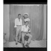 Three men: one wearing a boubou and hat sitting in profile in front and two men behind, one wearing a shirt and pants standing face-forward and the other wearing a suit standing face-forward, in the studio.