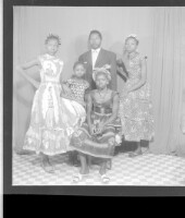 Five people, a man wearing a suit and two women and a girl standing face-forward and a woman sitting face-forward in the studio.