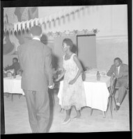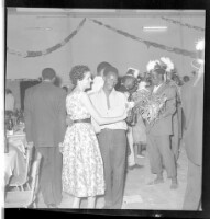 A young woman face-forward wearing a dress with a man facing backwards wearing a white shirt and black jacket in the foreground of a party, surrounded by two young people sitting around tables.