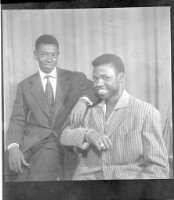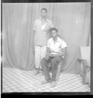 Two men, one wearing a white shirt and white pants standing and the other wearing a white shirt, black pants, and a military cap sitting on a chair with his arms crossed, both face-forward in the studio.