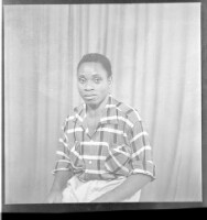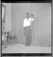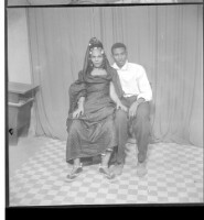 A Tuareg woman wearing a black pagne with her hair styled and a young man wearing a white shirt and black pants face-forward in the studio.