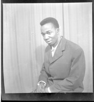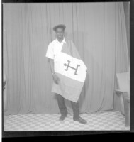 A man wearing a white shirt, black pants, and a military cap holding the first flag of Mali and standing face-forward in the studio.