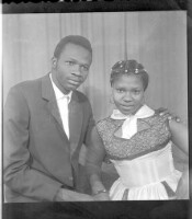 A man wearing a white shirt, black pants, and a black suit coat with a woman wearing a white and black dress, earrings, a gold-coloured hand bag, and a watch with her hair styled, both standing face-forward in the studio.