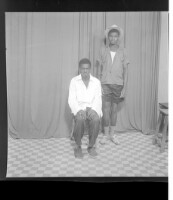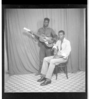 A man wearing a shirt and pants holding a guitar standing face-forward next to a man wearing a shirt and pants sitting in profile in the studio.