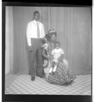 A man wearing a shirt, tie, and pants standing in profile next to a woman wearing a dress, pagne, head wrap, and necklace sitting face-forward holding a little on her lap in the studio.