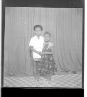 A boy wearing a shirt, shorts, and hat holding the hand of a little girl wearing a dress, both standing face-forward in the studio.