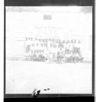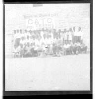 A family photo of 35 men, 19 sitting and 16 standing, taken behind a house with a banner filled with words hanging on it.