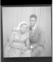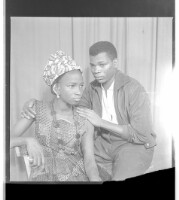 A man wearing a shirt sitting face-forward next to a woman wearing a dress and head wrap sitting in profile in the studio.
