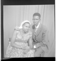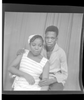 A man wearing a shirt and pants holding a woman wearing a dress, head wrap, and necklace sitting in profile in the studio.