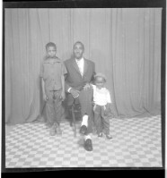 A man wearing a suit and tie sitting full frontal view in between two children, both standing full frontal view in the studio.
