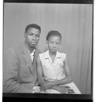 A man wearing a suit, sitting profile view next to a young woman wearing a dress, sitting full frontal view. Taken in the studio.