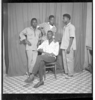 Four men wearing shirts and pants, one of whom is sitting profile view in front of three others who are standing, one facing forward and the two others from profile view. Taken in the studio.