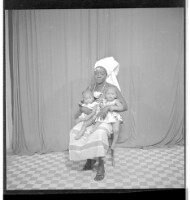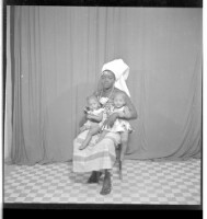 A woman wearing a robe pagne (wrapper dress) and a chain necklace, holding two little girls on her lap. Taken in the studio.
