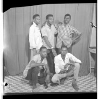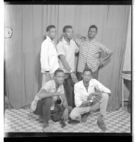 Five men wearing shirts and pants, two of whom are sitting, one facing forward and one from profile view. Behind them are the other three, all standing, one facing forward and one from profile view. Taken in the studio.