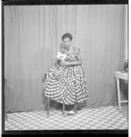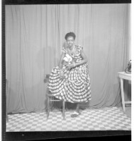 A woman wearing a robe pagne (wrapper dress) and a necklace, standing full frontal view with her foot on a chair. Taken in the studio.