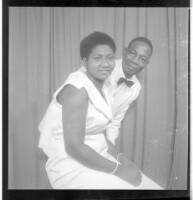 Full frontal view of a man wearing a suit leaning over behind a woman wearing a dress, sitting profile view in the studio.