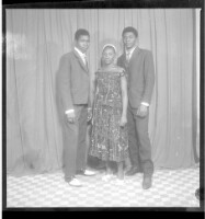 A woman wearing a dress and a head scarf standing full frontal view between two men in suits and ties, one standing profile view and the other facing forward. Taken in the studio.