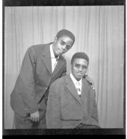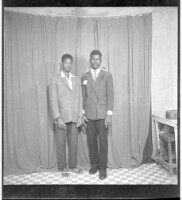 Two men wearing jackets and pants, one of whom is also wearing a tie. One is standing profile view and the other is facing forward. Taken in the studio.