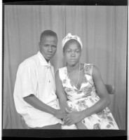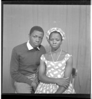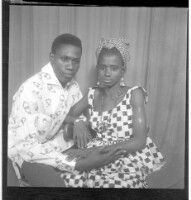 A man wearing a shirt sitting profile view next to a woman sitting full frontal view and wearing a dress, head scarf, and a chain necklace. Taken in the studio.