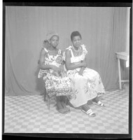 A woman wearing a robe pagne (wrapper dress) and a head scarf, holding a baby in her lap and sitting profile view next to another woman wearing a dress and necklaces, sitting full frontal view. Taken in the studio.