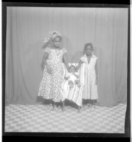 A baby wearing a T-shirt and shorts sitting full frontal view on a chair between two little girls wearing dresses, head scarves, and necklaces, both standing full frontal view in the studio.