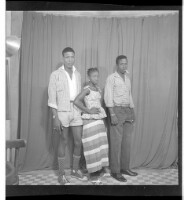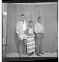 A girl wearing a robe pagne (wrapper dress) and a chain necklace between two men wearing shirts, one of whom is wearing shorts and the other is wearing pants and has a cigarette in his mouth. They're all standing profile view in the studio.