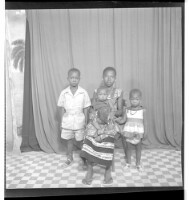 A girl wearing a robe pagne (wrapper dress) and a chain necklace, holding a baby on her lap, sitting full frontal view with a little boy wearing a shirt and shorts, and a little girl wearing a short dress and a necklace, both standing full frontal view in