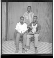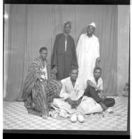 5 men, 2 are sitting profile view and one is wearing a shirt, sitting facing forward in front of two who are wearing boubous and hats, one is wearing glasses and both standing full frontal view in the studio.