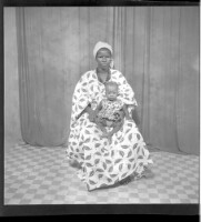 Full portrait if a woman wearing a black and white boubou, a head scarf and a necklace, with a baby, sitting and facing forward
