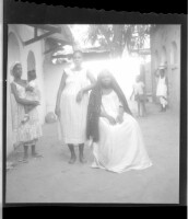 Full shot of six people in a court yard, family photo, three women, one sitting wearing a white boubou and with a new black loincloth, another woman standing wearing a white dress, and a woman standing to the side with a child, in the background two ch
