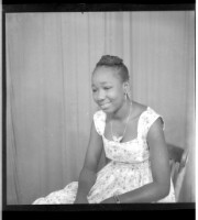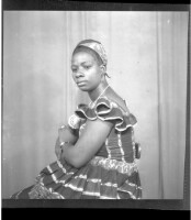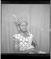 A young woman sitting on a chair wearing a black and white dress, a head scarf, earrings, and a necklace, crossed arms and facing sideways