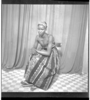 A woman sitting on a chair and wearing a camisole, a full black loincloth, a head scarf, a necklace, earrings and a watch , with arms crossed facing sideways