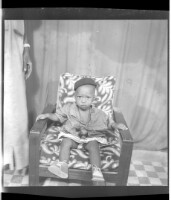 Full portrait of a little boy sitting on a chair, wearing a grey shirt, underpants, a black beret and grey shoes, facing forward