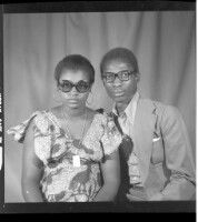 A couple, a man sitting wearing a shirt, a grey suit, and clear glasses, with a woman sitting wearing a full length camisole, a necklace, glasses, and earrings, facing forward