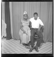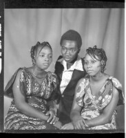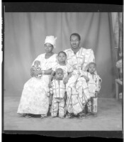 Copy of a full portrait of six people, a family photograph, to the left a woman sitting wearing a white boubou and a white headscarf, with a baby, in the middle two children standing, to the right a man sitting wearing a white and black boubou, with a lit